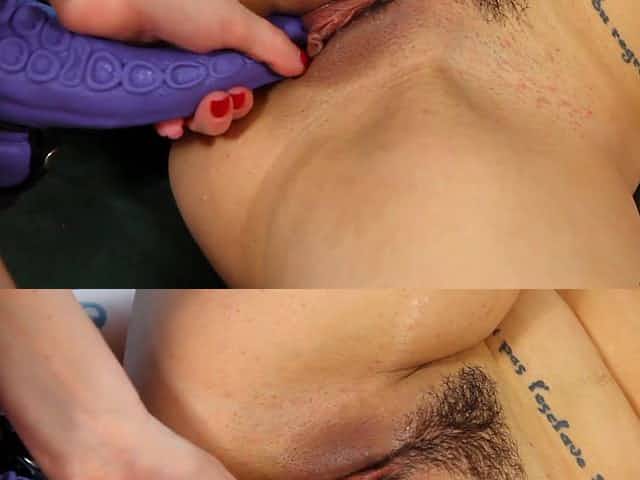 Long purple strapon dildo squeezed into her pussy