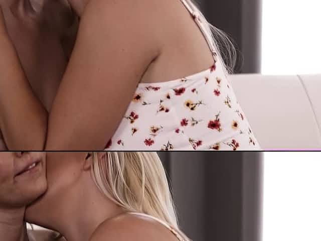 Hotties Ruth and Oxana are kissing and fucking on the sofa