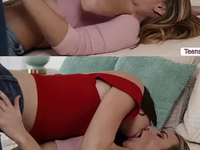 Lesbo teens giving a kiss and and licking soaked cunt in couch