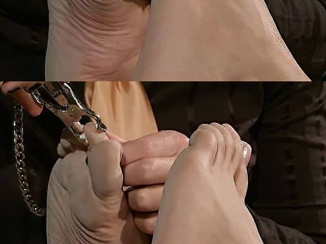 Sub tied up in the air pussy clamped by dominatrix
