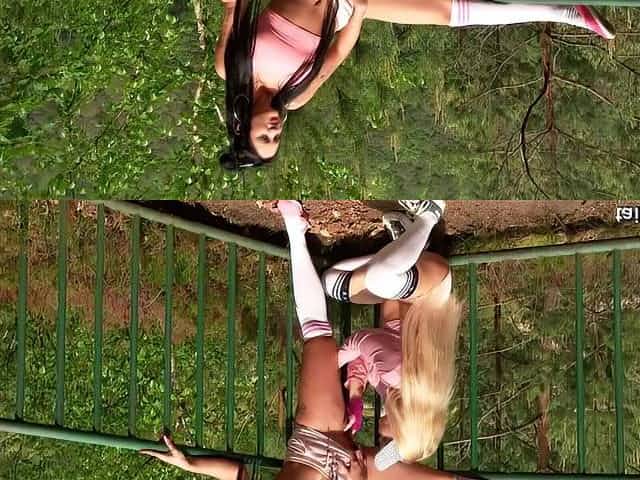 Brunette teen lesbians masturbating outdoors