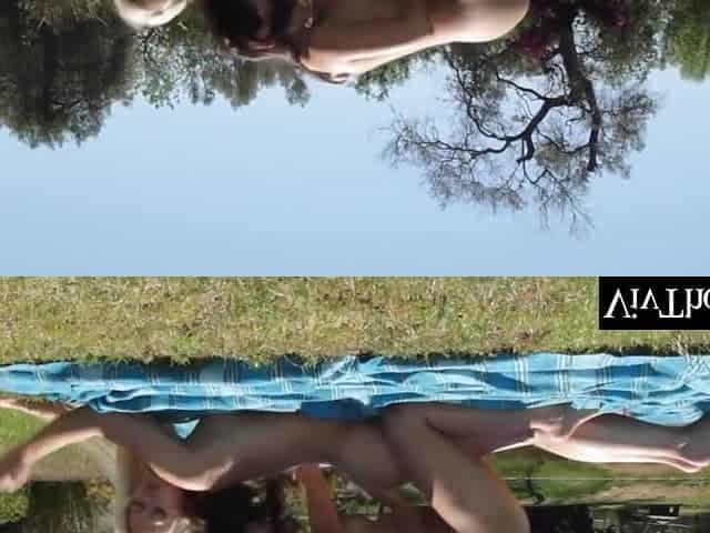 Hot brunette babes having lesbian sex outdoors