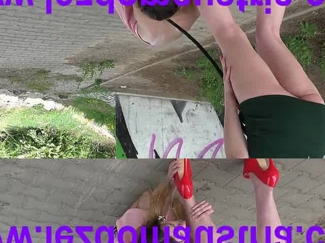 Hot redhead dominatrix punishes sexy girlfriend in public