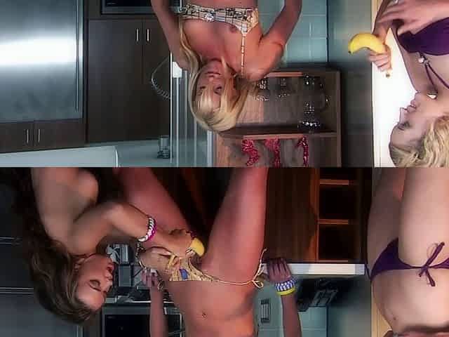 Kimberly, Samantha and Sophia play with a banana in the kitchen