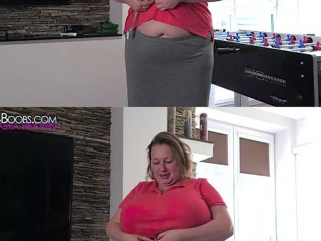 Fat chick demonstrates huge boobs and makes a deepthroat