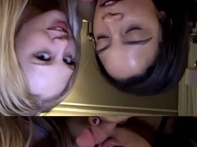 Lexi Lore and Lily Rader take turns at playing with a hard cock