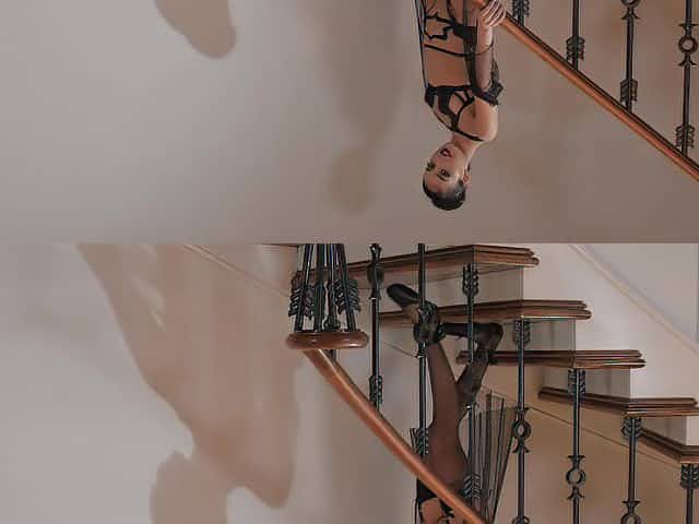 Mature wife Danica Collins in red lingerie teases on the stairs