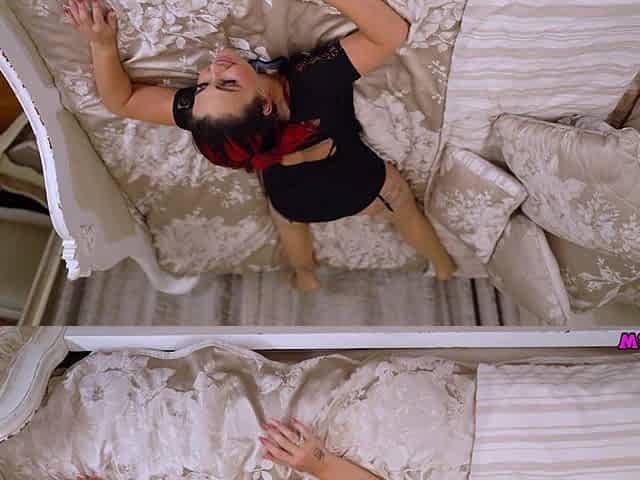 Emma gets into her red bed to masturbate