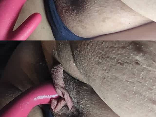 Teen stretches her big pussy lips and plays with a sex toy close up.