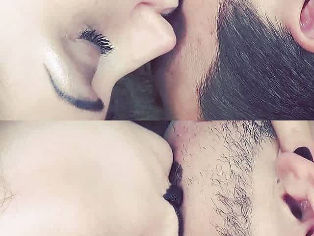 Covering Alex with black shiny lipstick kisses all over his face!