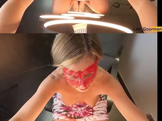 Masked lipstick milf sucks cock and takes a huge load on her tongue in stunning 4K close up!