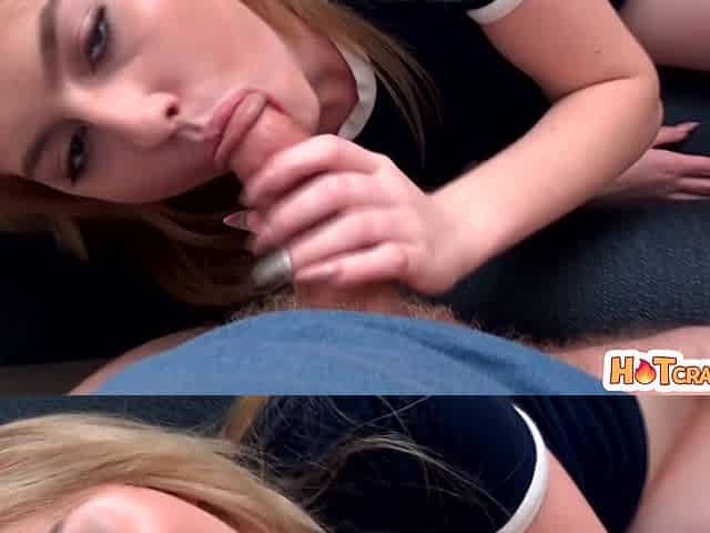 POV of blonde with saggy tits in pink bra giving long blowjob & handjob