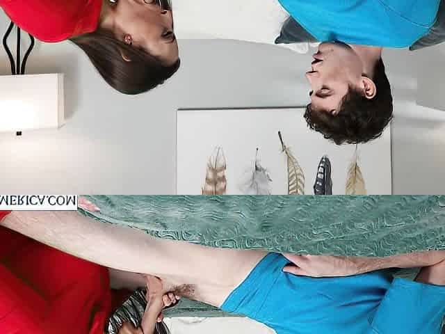 Beautiful busty brunette with nice ass strokes a long dick of her lover