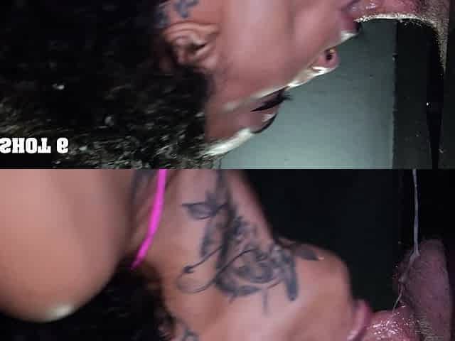 Sage Rabbit swallows a big load through a glory hole, showcasing her daring side.
