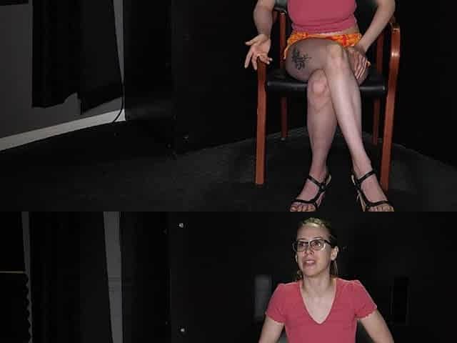 Backstage with a hot brunette porn actress, Sophie Torre, through a hole