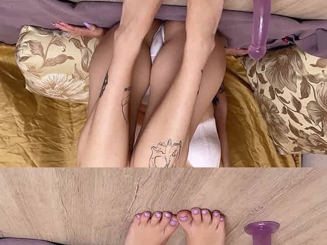 Petite teen explores new toy as she fingers and rides creamy pussy while showing off cute bare feet
