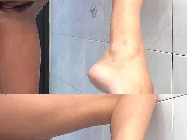 Beautiful brunette gets a shower and gives a blowjob to a lucky guy.