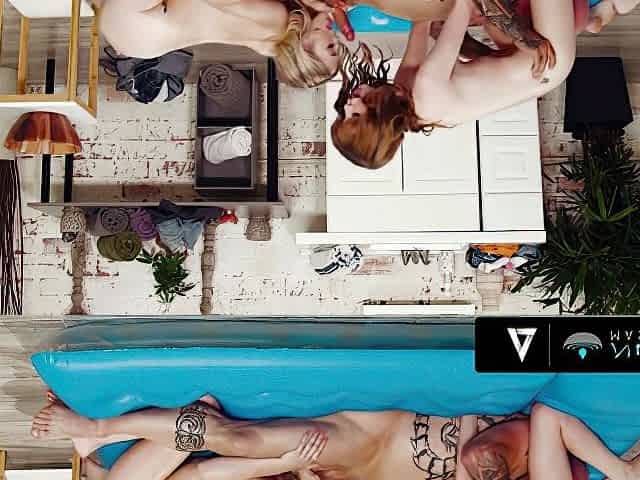 Blonde and brunette cuties have sex with two studs on the massage bed