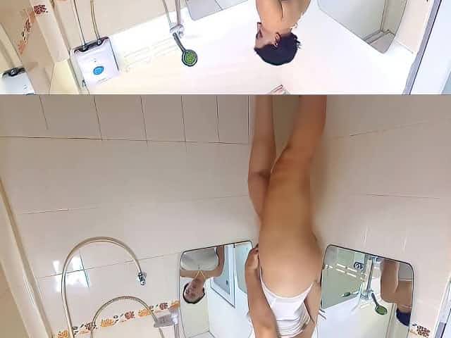 Nice lady in the shower room rubs cosmetic massage lotion oil on her beautiful legs. Try on haul un