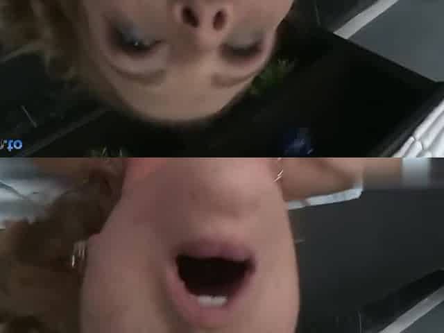 Attractive pale blonde babe Christie Stevens with big fake tits and slutty tattoos has wild oral session with ass licking stud a