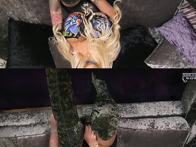 Bitchy babe with fake jugs Betty Boobs opens her pussy