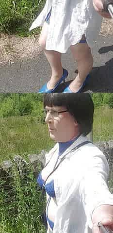 Crossdresser heels corset country walk about flashing
