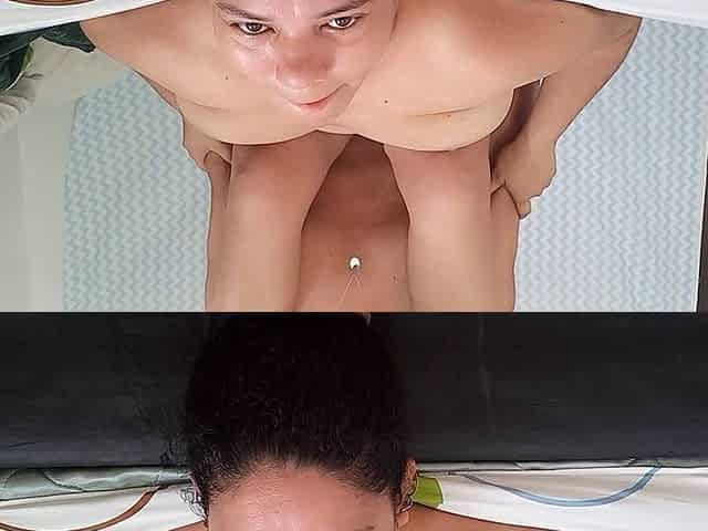 He plops down on his neighbor's face and fills her mouth with cum