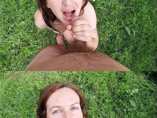 Beautiful blonde cougar with natural tits gets fucked in the woods after the picnic and gets facial with blowjob