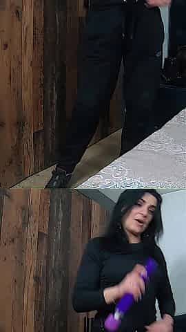 Big cock stud foot fucked by a brunette milf freak
