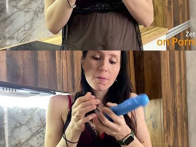 Wife teases with her sexy toes and plays with a blue dildo in the kitchen