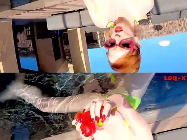 Red XXX fucks her pussy with a toy in the pool