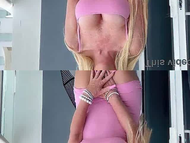 Sexy mother I'd like to fuck undresses without her pink suit and plays with her twat on balcony