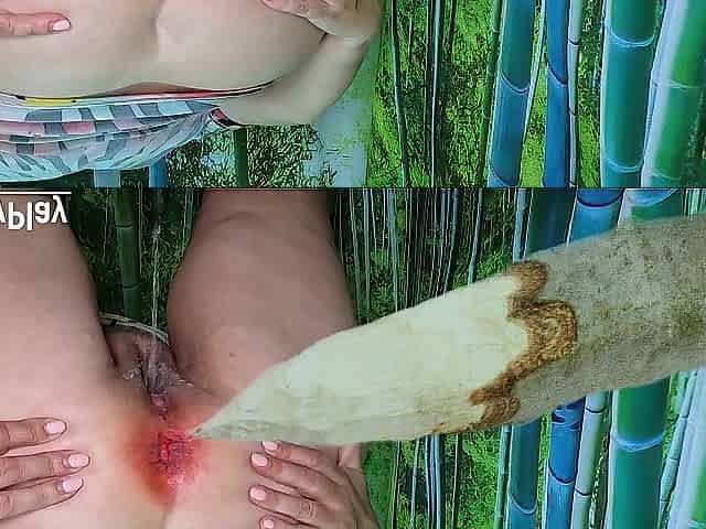 Destroyed booty peeing with creampie after wood tree anal bang