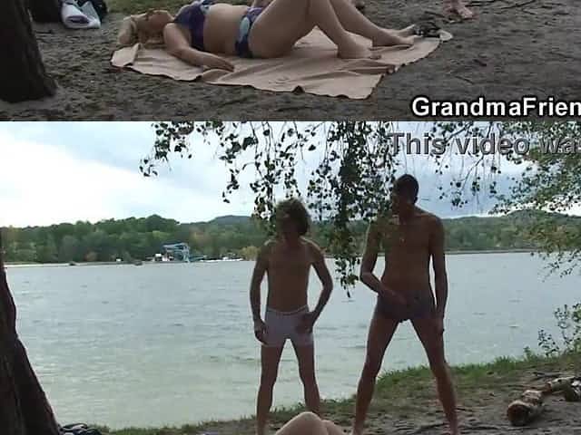 Old golden-haired granma sucking and riding outdoors