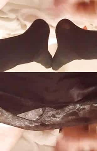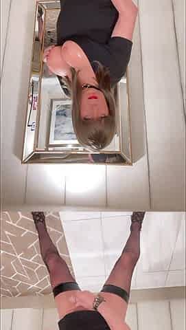 Mature transvestite TVROSE in black stockings and suspenders close up with long edges and multiple orgasms
