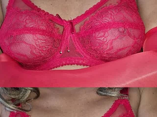 Sensual Red Lace Bra, Spandex Gloves, Caressing My Round and Firm Tits