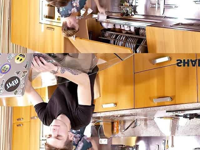 German aged with short hair and tattoos is having sex with a younger man, during the time that at work