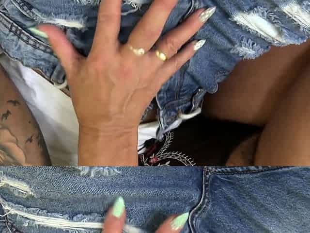 Joanne moans while fingering her dripping pussy on the sofa
