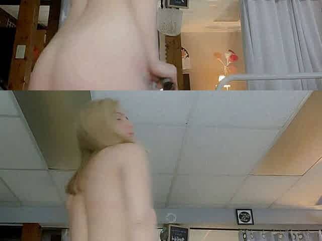 Platinum blonde spreads her legs so brunette can shove dildo up her cunt