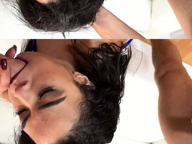 Cute exotic brunette Maya Bijou gets her mouth fucked by a fat dick
