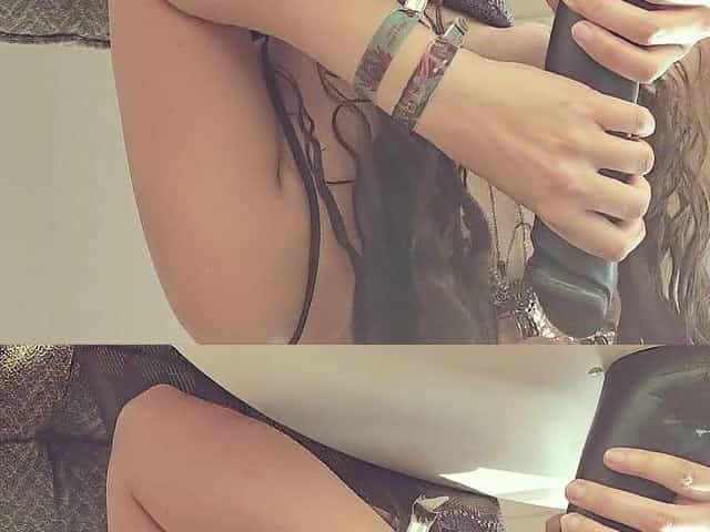 Promesita stips naked in black and fingers her pussy