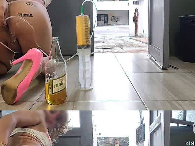 Tattooed booty sissy giving herself a 1l beer enema at the open door