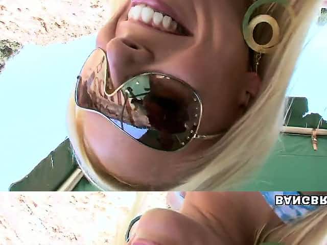 Slutty blonde is getting fucked by two big poles