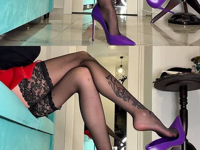 New Purple Classic Stiletto High Heels, 12 Cm Heels on Me and Black Stockings, Red Miniskirt