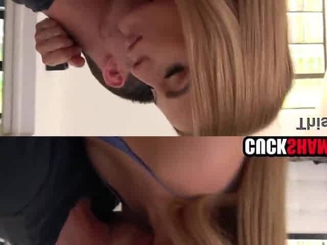 Tight slender blonde bitch eats long poker and spreads her long legs