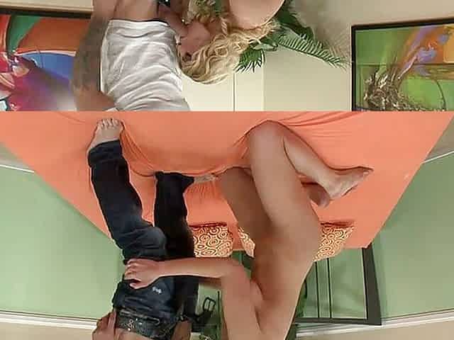 Blonde MILF Karen Fisher in interracial threesome with cum on her giant fake tits