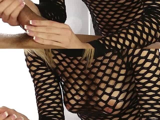 Milking busty babe giving table hole cock HJ to her man