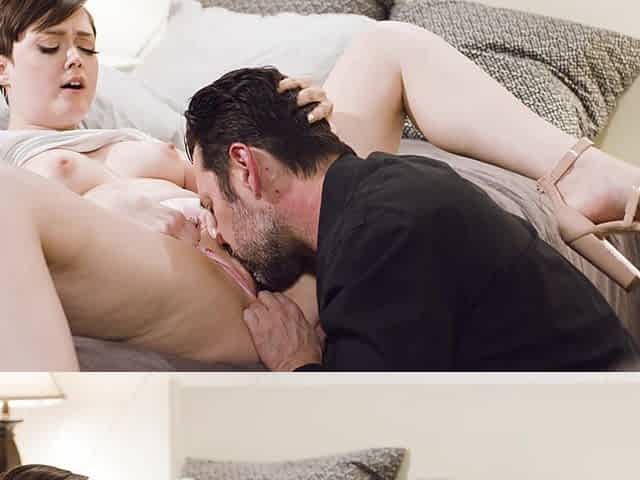 Brunette Renee Rose wearing high heels sucking a hard penis