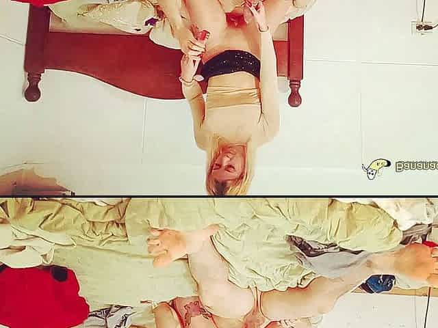 Blondie forgets to lock the door and is surprised by her friend while showing off on webcam