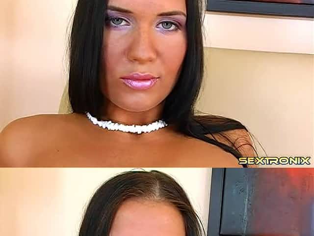 Tanned Euro babe in pretty purple eye shadow fucks her big dildo
